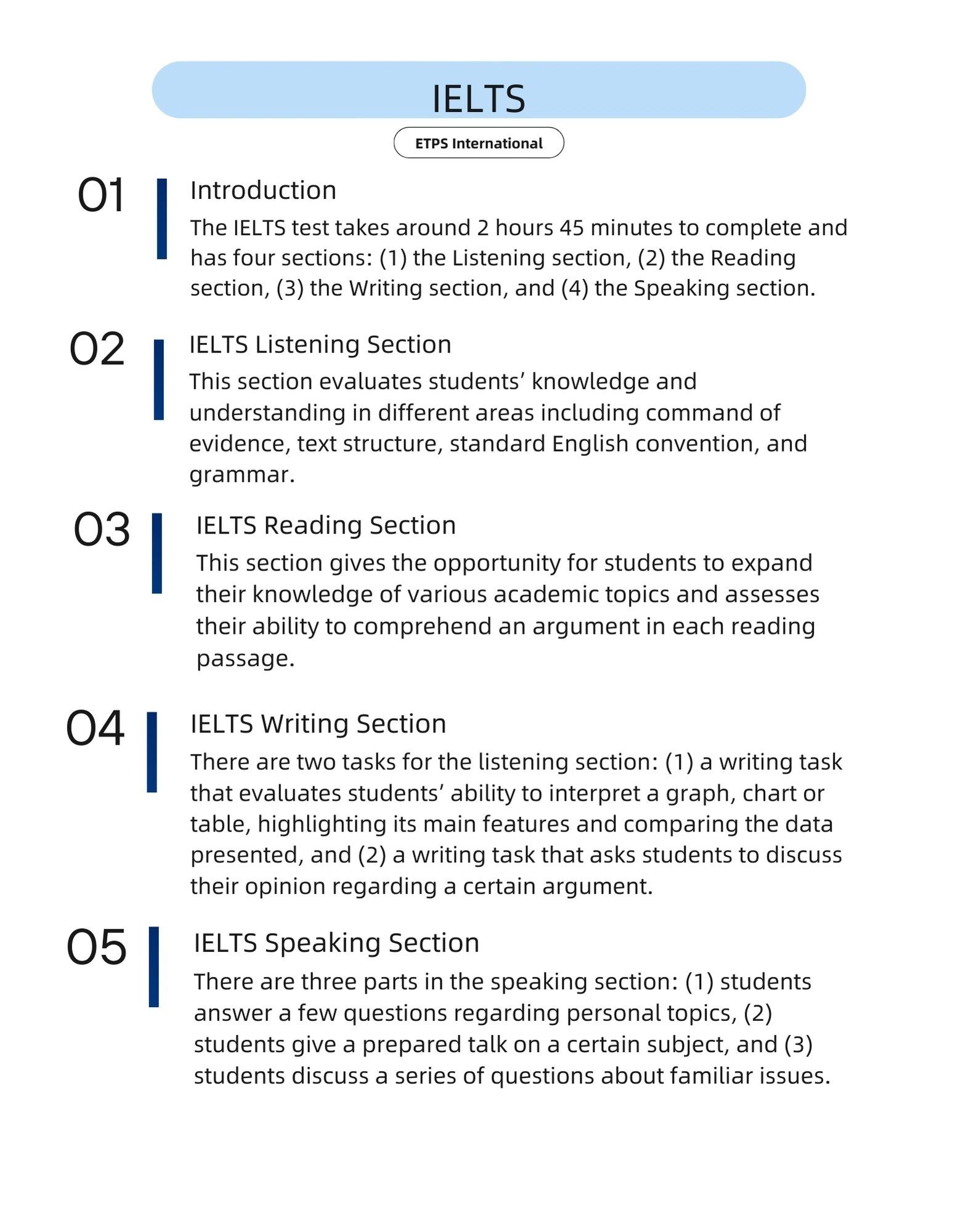 The materials and teaching methods utilized at the ETPS International help students achieve their academic goals and reach their full potential. Students who still have a basic level of English are welcomed to apply for the IELTS Total Prep.